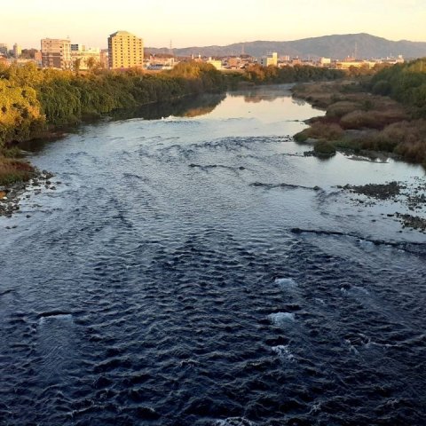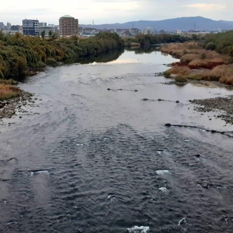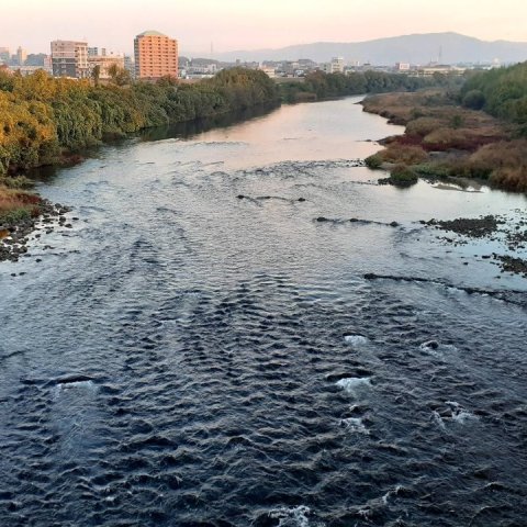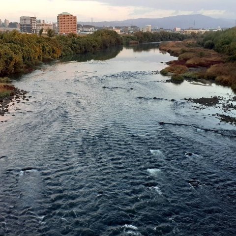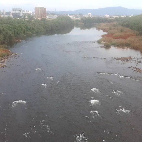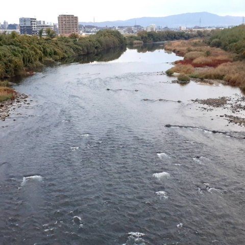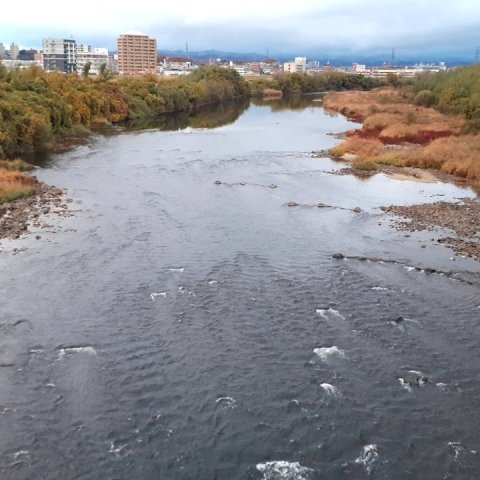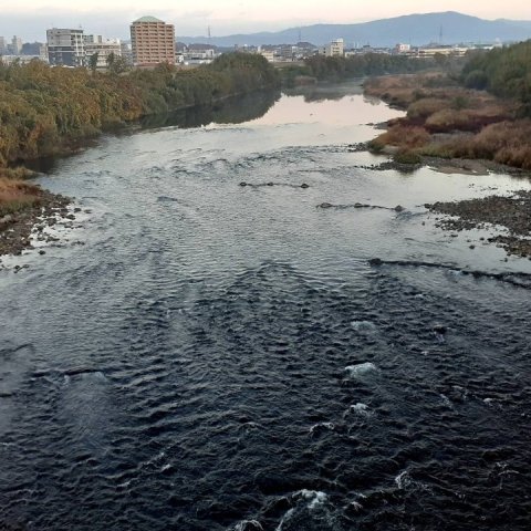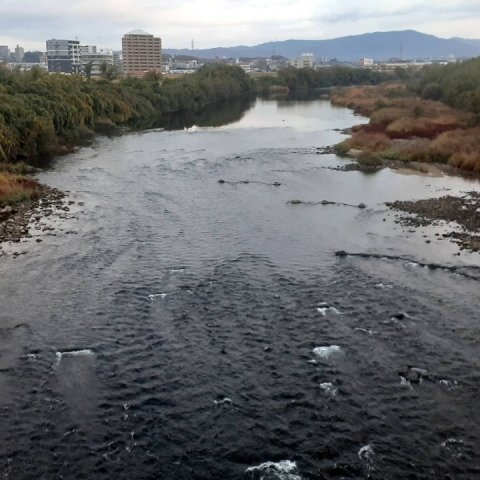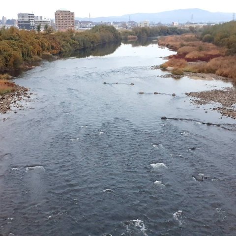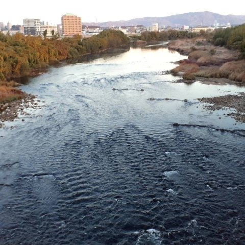 高橋の瀬の様子。 水温14,5℃、水量並み、濁りなし。 白鷺の群れが落...