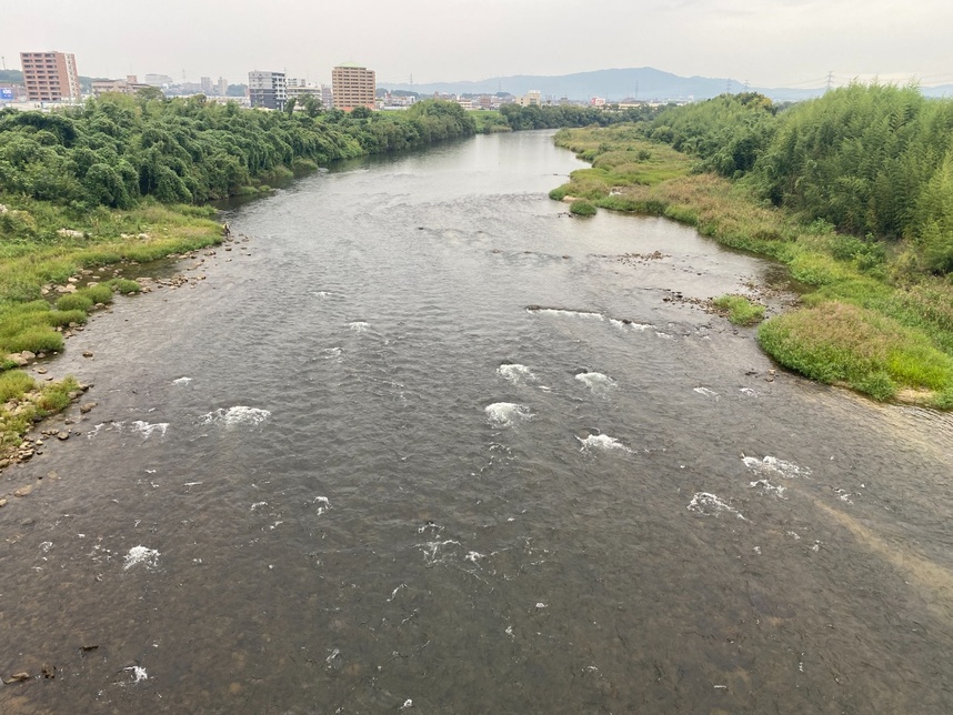 令和7年10月4日 川情報 高橋の瀬の様子。 水温22,1℃、超渇水、濁りなし。 本日は雨天、川の水を冷やしてくれそうです。 降下期になり成熟の早い親魚は、産卵のために次第に群れを形成し下流へと移動していきます。 アユにとっては良い雨が降りました。