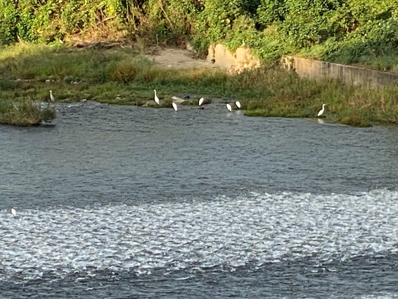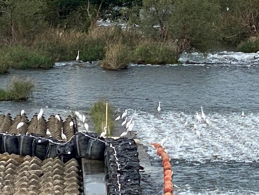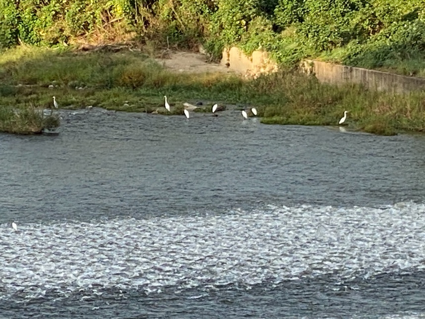 降下アユを狙って白鷺が集まる。