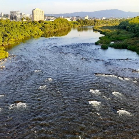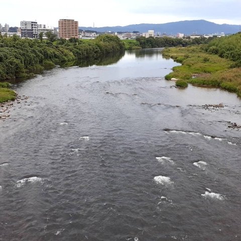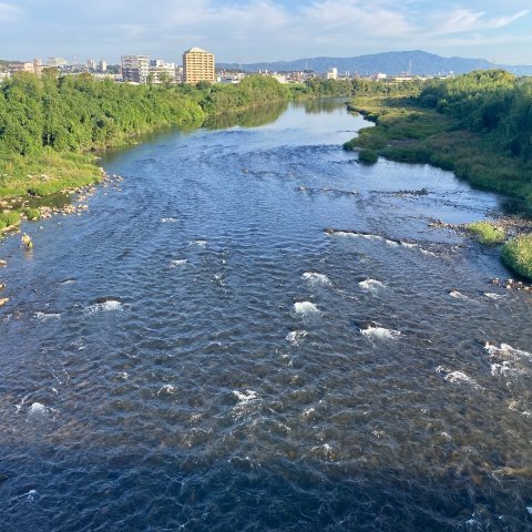 ヤゴだしの瀬の様子。 超渇水、橋から覗くもアユの姿見つけにくい。 河...