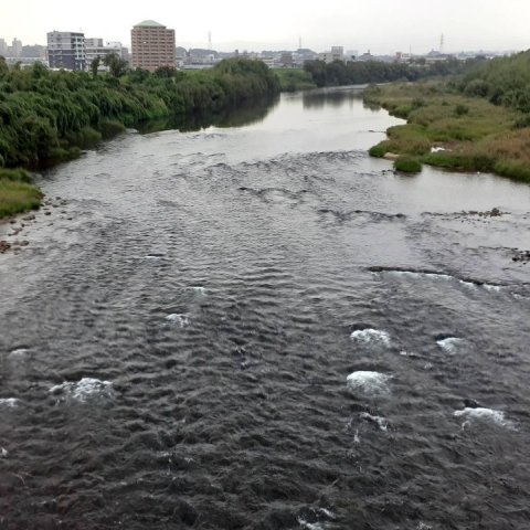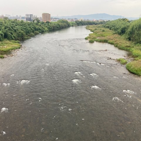 高橋の瀬の様子。 水温22,1℃、超渇水、濁りなし。 本日は雨天、川の...